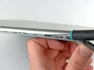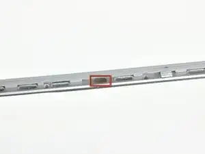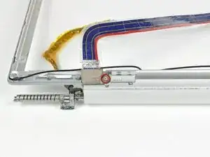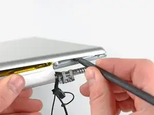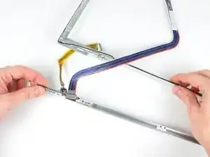 Аккуратно поддев заднюю рамку дисплея от блока дисплея, используйте маленькую отвёртку с плоским шлицем, чтобы отогнуть небольшой стальной зажим, ближайший к нижнему правому углу дисплея, от кромки передней рамки дисплея.