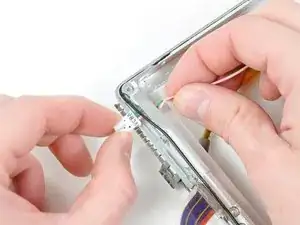 Используйте плоский конец металлической лопатки, чтобы аккуратно оторвать клей, фиксирующий металлическую рамку ЖК-экрана к передней рамке, особенно осторожно, чтобы не поцарапать ЖК-экран.