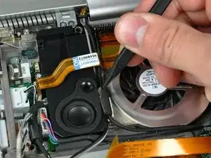 При необходимости используйте кончик лопатки, чтобы снять небольшой кусочек вспененной ленты с боковой стороны левого динамика.