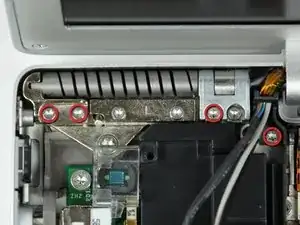 При удалении винтов дисплея следите за тонким металлическим кронштейном (показан зеленым), находящимся под винтами на внутреннем кронштейне дисплея.