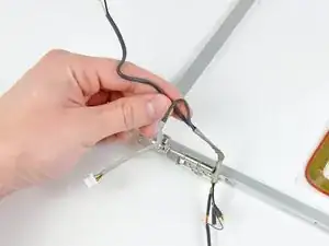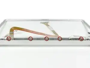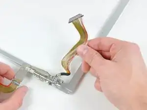 Используйте плоский конец лопатки, чтобы снять фольгированную ленту, закрепляющую кабель видеоданных к каркасу ЖК-дисплея.