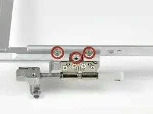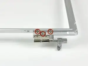 Снимите три винта T8 типа Torx, крепящих правый шарнир крышки к передней рамке дисплея.