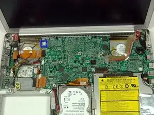 Отключите два антенных кабеля от платы Wi-Fi/Bluetooth (показаны жёлтыми кружками), а также кабель дисплея (широкий разъём в правом верхнем углу) и кабель в левом верхнем углу материнской платы (показано синим квадратом).