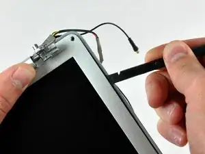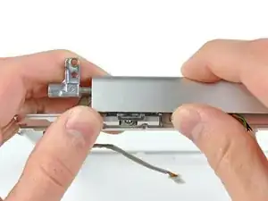 Повторите процедуру для второй стороны крышки шарнира. После того как крышка полностью освободится от шарниров, снимите её с передней рамки дисплея.
