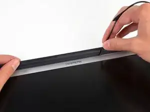 Используйте медиатор, чтобы аккуратно поддеть клей вдоль верхнего края, фиксирующий окантовку к сборке дисплея.