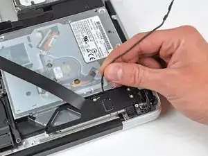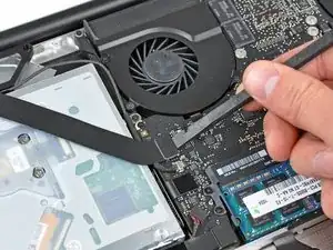 Используйте плоский конец лопатки, чтобы аккуратно приподнять лентовый кабель AirPort/Bluetooth с его разъёма на логической плате.
