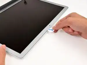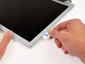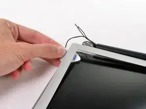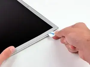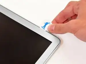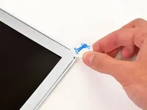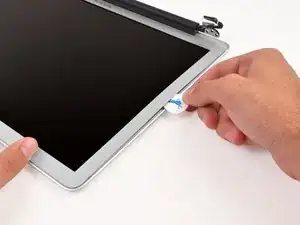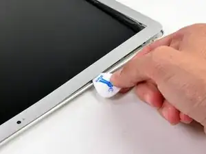 Вставьте медиатор между окантовкой и сборкой дисплея рядом с внутренним левым нижним углом.