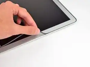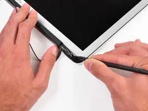 Продолжайте поддевать вдоль внутреннего нижнего края, чтобы освободить клей, фиксирующий окантовку к сборке дисплея.