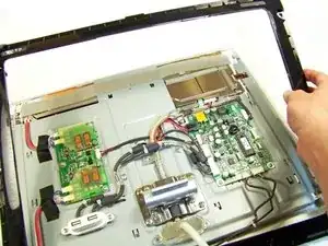 Найдите и удалите единственный винт с крестовой головкой, удерживающий экранирующую панель (EMI) к дисплею.