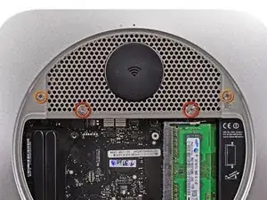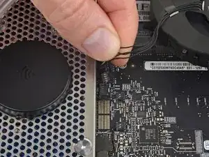 Открутите два винта Torx T6 длиной 11,3 мм, крепящих вентилятор к плате логики рядом с антенной пластиной.