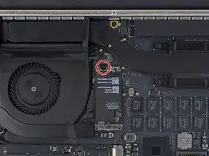 Удалите единственный винт T5 с головкой в виде звезды длиной 2.9 мм, крепящий плату AirPort.