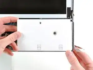 Снимите переднюю рамку с задней крышки и отведите её от нижнего края iMac, учитывая подключенные кабели камеры и микрофона в её верхней части.