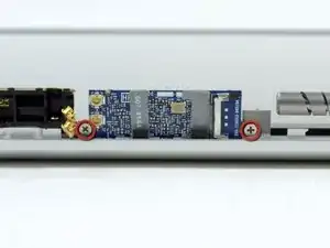 Удалите два винта Phillips #00 длиной 3.1 мм, закрепляющие плату AirPort в корпусе дисплея.