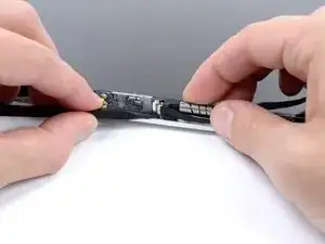 Поднимите чёрную пластиковую заслонку, прикреплённую к держателю кабеля дисплейных данных, и поверните её в сторону разъёма питания DC-In на MacBook.