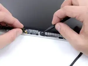 Выверните два винта Phillips 7,1 мм, крепящие держатель кабеля данных дисплея к верхней части корпуса.