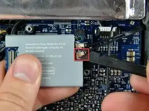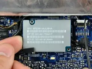 Поднимите плату AirPort/Bluetooth за её левый край, чтобы отсоединить её от разъёма на логической плате.