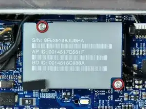Снимите два винта Torx T6, крепящие плату AirPort/Bluetooth к логической плате.