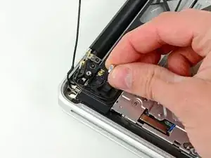 Используйте острый конец лопатки, чтобы приподнять четыре антенных разъёма из их гнёзд на плате AirPort/Bluetooth.