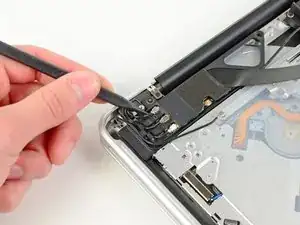 Используйте плоский конец лопатки, чтобы отжать кабель AirPort/Bluetooth от его гнезда на плате AirPort/Bluetooth.
