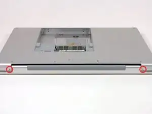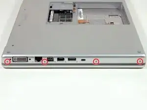 Поверните компьютер на 90 градусов и удалите два винта Philips длиной 3.2 мм с задней стороны компьютера.