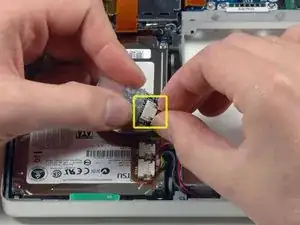 Вытащите плату Bluetooth из её разъёма рядом с жёстким диском и с помощью лопатки отсоедините антенный кабель Bluetooth.