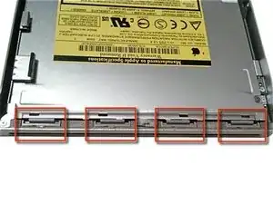 Совет при сборке: два центральных зацепа над приводом DVD, как правило, не фиксируются должным образом самостоятельно, а при нажатии рама вокруг слота DVD деформируется. Поддерживайте раму, вставив пластиковую лопатку в слот DVD точно под местом крепления зацепа, пока она не встанет плотно, затем нажмите вниз, пока не услышите щелчок.