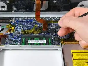 Будьте осторожны, отключая шлейф клавиатуры и тачпада, чтобы убедиться, что задняя часть верхней крышки освобождена от области рядом с петлёй. Легко случайно погнуть приёмники шурупов по бокам от клавиатуры.