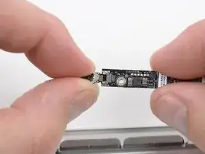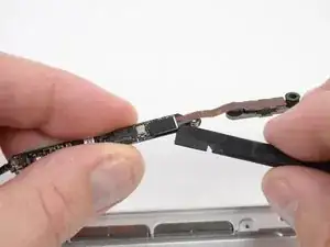 Перед отключением кабеля камеры необходимо сначала отодвинуть небольшой пластиковый держатель, приклеенный к логической плате. В моделях конца 2011 года этот шаг можно пропустить, так как на разъёме кабеля камеры нет пластикового держателя.
