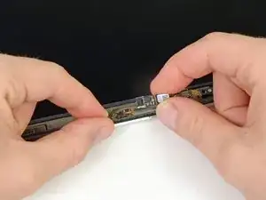 После отделения верхнего левого угла от дисплея может быть полезно использовать медиатор или другой тонкий пластиковый предмет, чтобы стекло не прилипло обратно к узлу дисплея.