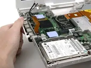 Если в вашем iBook есть Bluetooth, как описано в предыдущем шаге, вам нужно будет провести антенну через нижнее I-образное отверстие в щитке перед полным снятием щитка.