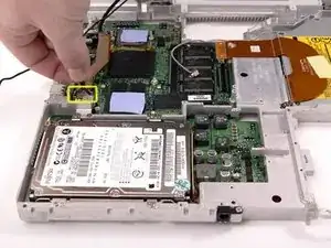 На этой фотографии отсутствует антенна Bluetooth, которая присутствует в некоторых iBook. Она расположена в верхнем правом углу отсека аккумулятора, прямо над винтом 4 мм. Скобу антенны видно на фото — это две I-образные вырезы прямо над винтом 4 мм, которые нужно снять в этом шаге. Чтобы снять антенну, сдвиньте её в сторону ЖК-дисплея и наклоните вертикально назад к себе.