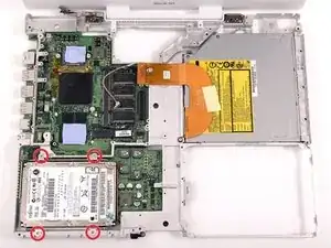Из-за вариаций между моделями iBook G4 радиатор может иметь 5 или 6 винтов. Мы отметили все возможные позиции винтов в шаге ниже. Если винта нет — пропустите его. Обязательно снимите все необходимые винты перед попыткой снять радиатор.