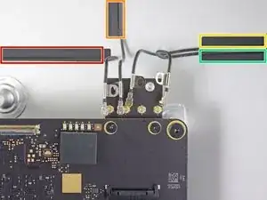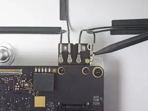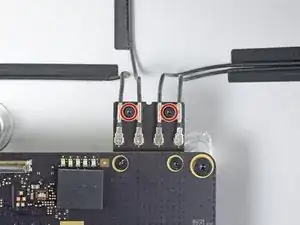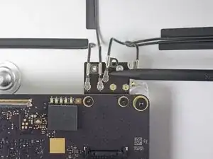 Используйте отвертку Torx T5, чтобы удалить два винта 4 мм, фиксирующие кабели антенн AirPort/Bluetooth.