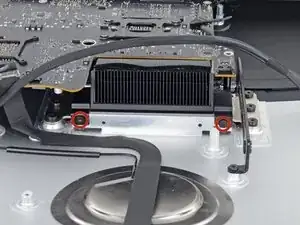 Используйте отвертку Torx T8, чтобы удалить два винта 5.6 мм с верхней части корпуса воздуховода радиатора.