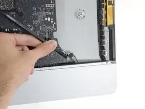 Поднимите плату логики прямо вверх и извлеките из iMac. Будьте внимательны, чтобы не зацепить её за какие-либо стоячие винтовые стойки, прикреплённые к внутренней поверхности задней крышки.