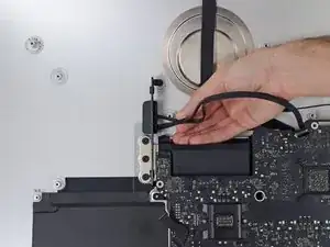 Протяните кабель SATA жёсткого диска и разъём через правый кронштейн жёсткого диска. Переместите кабель к правой стороне iMac, чтобы он не мешал выходному отверстию для выхлопа.