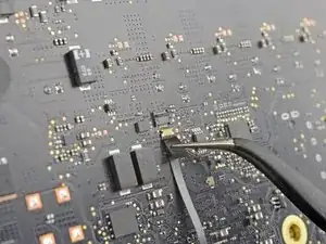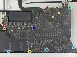 Этот винт находится под отверстием в плате логики. Если вы не используете набор отверток iFixit, вам может понадобиться удлинитель или отвертка с более длинным стержнем.