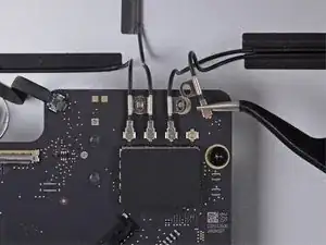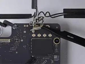 С помощью пинцета отсоедините четыре антенных кабеля от материнской платы.