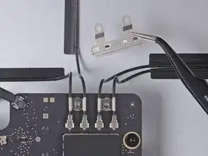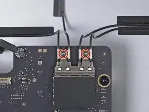 Используйте отвёртку Torx T5, чтобы выкрутить два винта 4 мм, фиксирующие кабели антенн AirPort/Bluetooth.