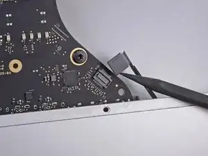 Используйте лопатку, чтобы ослабить разъём кабеля правого динамика в гнезде на плате логики.