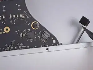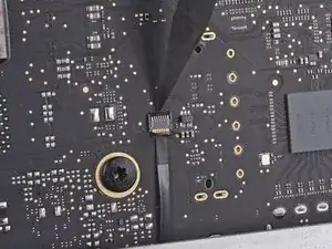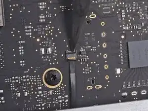 Этот винт расположен под отверстием в плате логики. Если вы не используете набор отвёрток iFixit, может потребоваться удлинитель или отвёртка с более длинным стержнем.