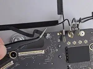 С помощью пинцета или пальцев отсоедините шлейфовый кабель слева от антенных кабелей от платы логики.