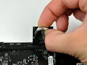 Сдвиньте батарею PRAM в направлении центра платы и вытащите её из держателя. Придется сдвинуть батарею дальше, чем кажется, чтобы она выпала.