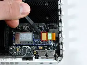 Используйте плоский конец лопаточки, чтобы поддеть три антенных разъёма с карты AirPort/Bluetooth и отсоединить их.