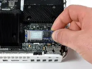 Чёрно‑синий антенный кабель подключается к карте AirPort около угла мини, а белый антенный кабель — ближе к центру мини.