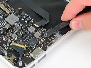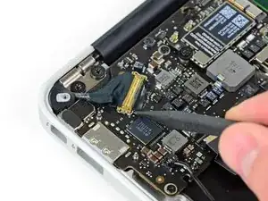 Выньте ленточный кабель трекпада прямо из разъема в направлении переднего края Air.