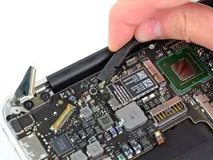 Используйте плоский конец лопатки, чтобы отжать и снять оба разъема антенных кабелей с их гнезд на карте AirPort/Bluetooth.