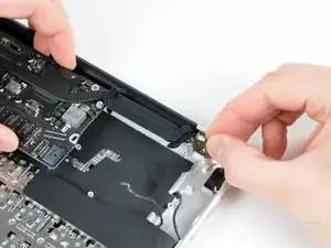 Немного приподнимите свободный край платы AirPort/Bluetooth и вытащите её из разъёма на логической плате.