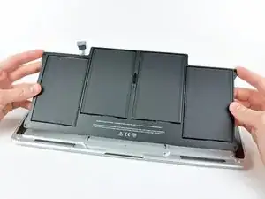 Возьмитесь за прозрачную пластиковую вкладку, прикреплённую к разъему батареи, и потяните её в направлении переднего края Air, чтобы отключить батарею от платы логики.