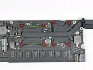 Удалите восемь винтов T5 Torx длиной 2.5 мм, фиксирующих радиатор к логической плате.
